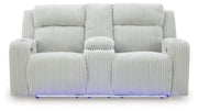 Trend-right style, meet irresistible modern function. Your living room gets a cozy-cool upgrade with the TwinBrooke power reclining loveseat. Curl up in its ultra-chic corded upholstery and recline with one-touch controls. Is it movie night or game time? With ambient LED lighting, this loveseat transforms from a serene relaxation spot to an entertainment hub.