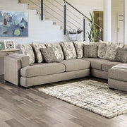 ANGELIA Sectional, 145"L X 125"W X 37"H, 427lbs. A salt and pepper tough knit fabric graces the upholstery of this gloriously roomy sectional. One arm end and a center section make up this extremely accomodating and comfortable set of lounging furniture. A must-have for those with a large family or many friends.