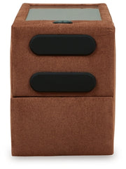 - Storage and audio consoles with removable plexiglass top and pull-out drawer; audio console includes built-in sound system with wireless connectivity, audio controls and USB charging