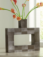 Stunning from all angles, this vase's contemporary geometric form acts as a captivating focal point for your mantle or bookshelf. Its antiqued nickel-tone body is detailed with subtle texture for added visual appeal. What a perfect fit for those seeking forward-thinking style.