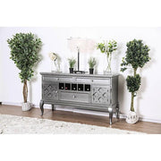 Amina Gray Server, 59 7/8"W X 18 1/2"D X 34 1/4"H, 81.5lbs. This dining collection will be the focal point of any home with its cool gray finish and elegant structure. This stunning server features on its front panels the same Moroccan-inspired inset patterns found on the matching table. Wine storage, drawers , and shelves provide storage for a stylish and functional piece. Features: Transitional Gray Glass, Solid Wood, Wood Veneers, Others Two 5mm Tempered Glass Inserts Cabriole Legs Crystal-Like Acrylic Hardware